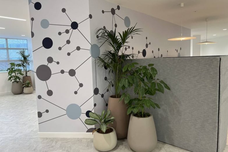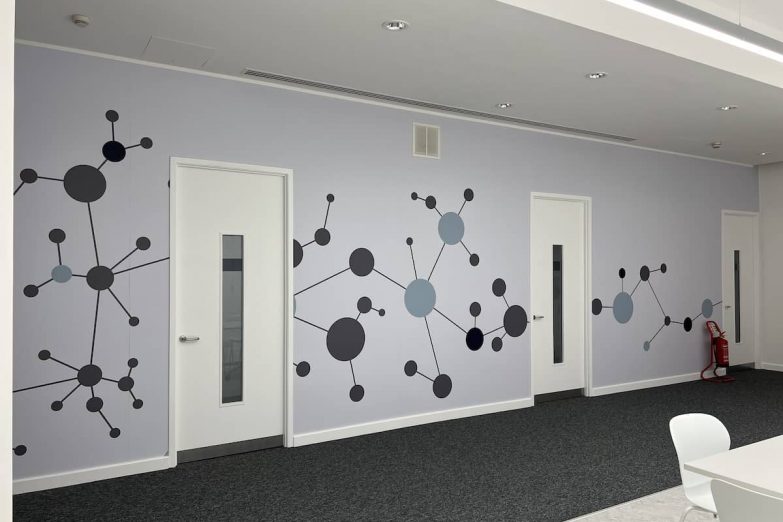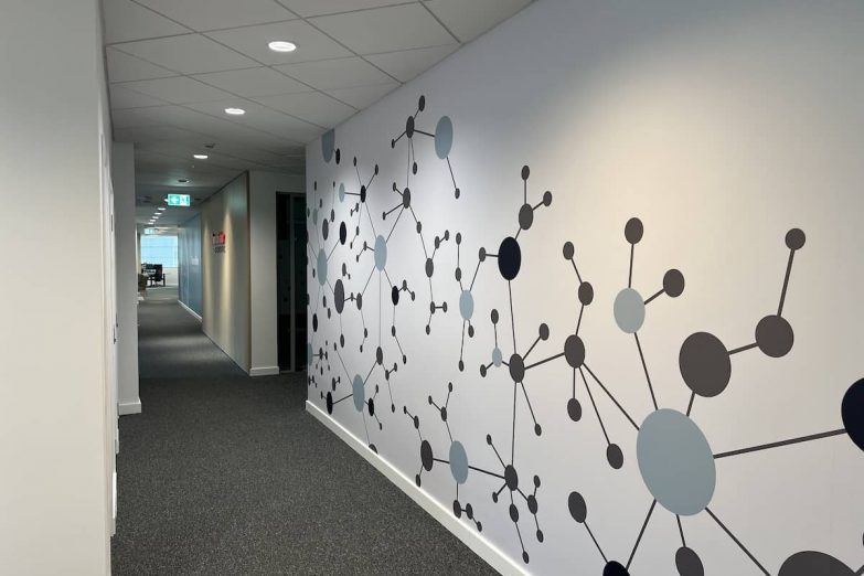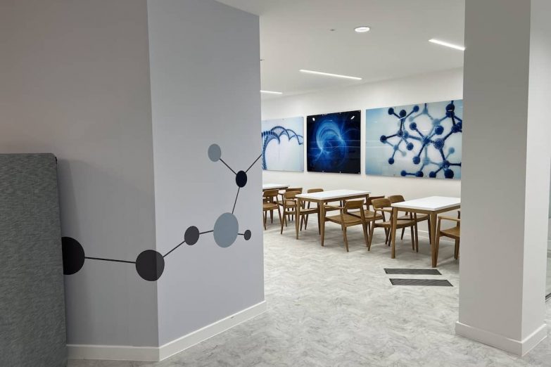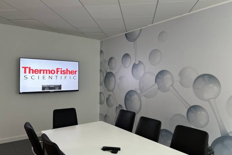 More than ten full wall graphics were installed throughout the building, including a 30-metre-long stretch with precise alignment from end to end. These weren’t generic stock images — they were hand-picked scientific visuals and brand graphics that reinforced ThermoFisher’s identity. Every corridor and communal space was turned into an opportunity to inspire, educate, or impress.