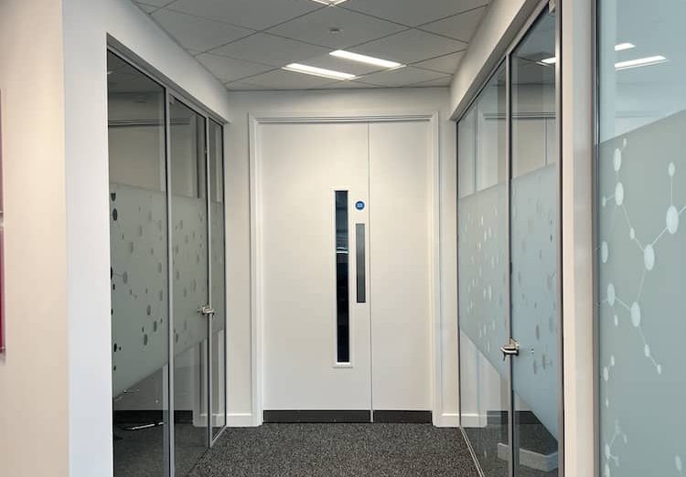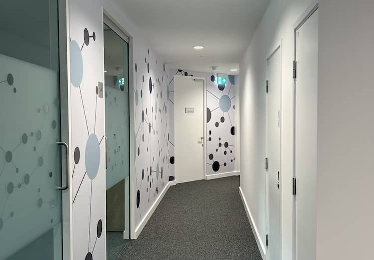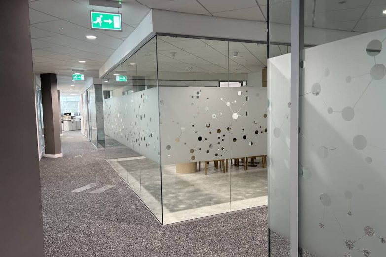 We applied a bespoke frosted glass manifestation design across 200 internal glass panes over three floors. The repeatable pattern mirrored molecular structures, a subtle but striking nod to the company’s work in science and innovation. The finish gave the space cohesion while also providing much-needed privacy in meeting rooms and open-plan areas.