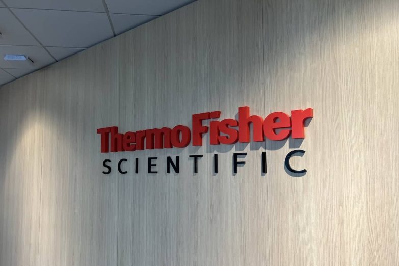 We also installed custom acrylic 3D lettering throughout the building, colour-matched to ThermoFisher’s exact brand palette. These thick-cut letters were mounted to key corridor and lobby walls, giving a smart, permanent finish that tied the entire space together.